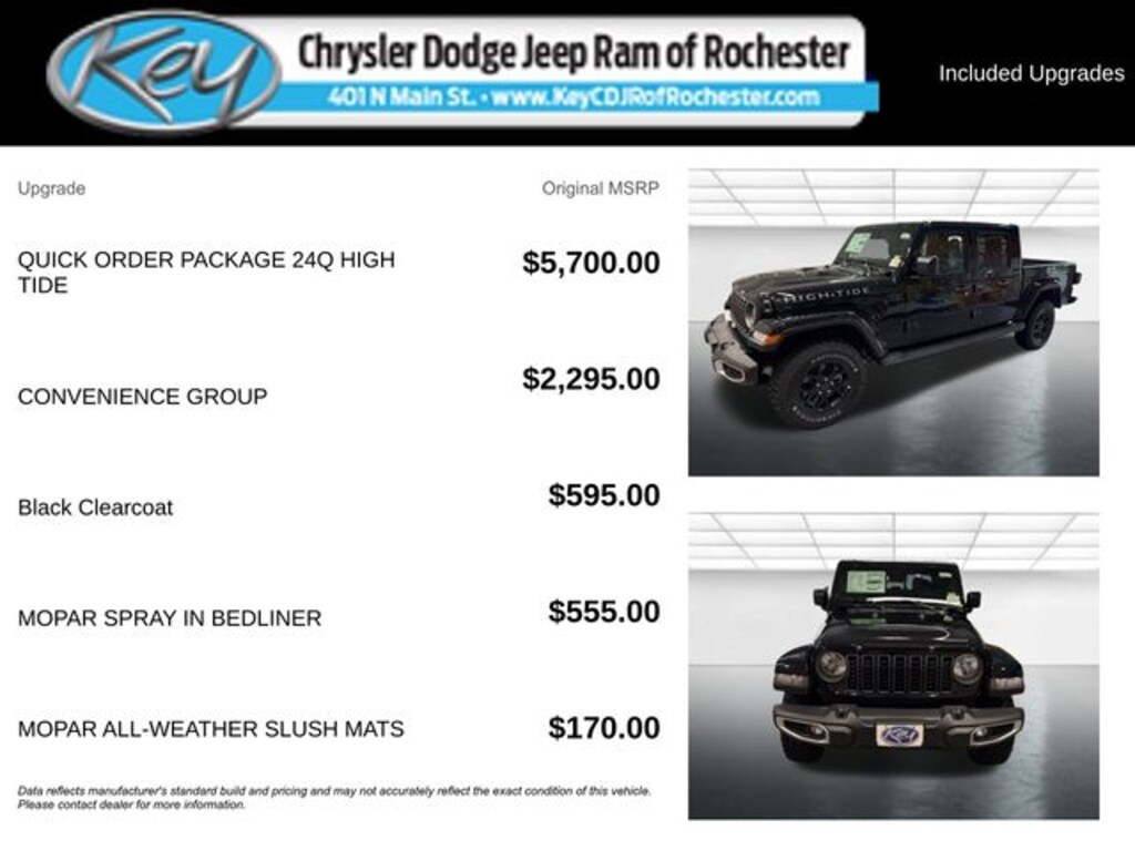 Key Chrysler Dodge Jeep Ram of Rochester is proud to present you with another True Market Priced Vehicle. This 2025 Jeep Gladiator High Tide is loaded with the following Factory Options: Convenience Group (Corning Gorilla Glass, Daytime Running Lamp System, Emergency/Assistance Call, Front Door Locks 2-Door Passive Entry, Heated Front Seats, Heated Steering Wheel, Remote Start System, and Universal Garage Door Opener), Quick Order Package 24Q High Tide (97 MPH Vehicle Max Speed Calibration, Advanced Brake Assist, Automatic Headlamps, Body Color 3-Piece Hard Top, Body Color Fender Flares (2-Piece), Deep Tint Sunscreen Windows, Freedom Panel Storage Bag, Full Length Floor Console Premium Armrest, Full Speed Forward Collision Warning Plus, Hard Seat Back, High Tide, High Tide Tailgate & Hood Decals, Integrated Radar Camera Module (IRCM), Leather Wrapped Park Brake Handle, Leather Wrapped Shift Knob, Power 4-Way Driver Lumbar Adjust, Power 4-Way Passenger Lumbar Adjust, Power Adjust 8-Way Driver Seat, Power Adjust 8-Way Front Passenger Seat, Power Heated Mirrors, Premium Door Trim Panel, Premium McKinley Trimmed Seats, Premium Wrapped Steering Wheel, Rear Armrest w/Cupholder Seat, Rear Sliding Window, Rear Window Defroster, Security Alarm, Sun Visors w/Illuminated Vanity Mirrors, Wheels: 17" x 7.5" Painted Black, and Willys Suspension), 110 MPH Vehicle Max Speed Calibration, 12.3" Touchscreen Display, 3.73 Rear Axle Ratio, 4-Wheel Disc Brakes, 4G LTE Wi-Fi Hot Spot, 8 Speakers, ABS brakes, Air Conditioning, Alexa Built-In, AM/FM radio: SiriusXM, Apple CarPlay, Apple CarPlay/Android Auto, Brake assist, Cloth Low-Back Bucket Seats, Compass, Connectivity - US/Canada, Delay-off headlights, Driver door bin, Driver vanity mirror, Dual front impact airbags, Dual front side impact airbags, Electronic Stability Control, Front anti-roll bar, Front Bucket Seats, Front Center Armrest w/Storage, Front fog lights, Front License Plate Bracket, Front reading lights, Google Android Auto, Illuminated entry, Integrated roll-over protection, Low tire pressure warning, MOPAR All-Weather Slush Mats, MOPAR Spray In Bedliner, Normal Duty Suspension, Occupant sensing airbag, Outside temperature display, Overhead airbag, Panic alarm, ParkView Rear Back-Up Camera, Passenger door bin, Passenger vanity mirror, Power steering, Power windows, Radio data system, Radio: Uconnect 5 w/12.3" Display, Rear anti-roll bar, Rear reading lights, Remote keyless entry, Side Steps, Speed control, Split folding rear seat, Steering wheel mounted audio controls, Tachometer, Telescoping steering wheel, Tilt steering wheel, Traction control, Trip computer, USB Host Flip, Variably intermittent wipers, Voltmeter, and Wheels: 17" x 7.5" Black Steel Styled!! Call us to ask about conditional rebates. Price includes: $2000 - 2025 National Holiday Select Inventory Bonus Cash. Exp. 01/05/2026 $2250 - 2025 National Bonus Cash . Exp. 01/05/2026