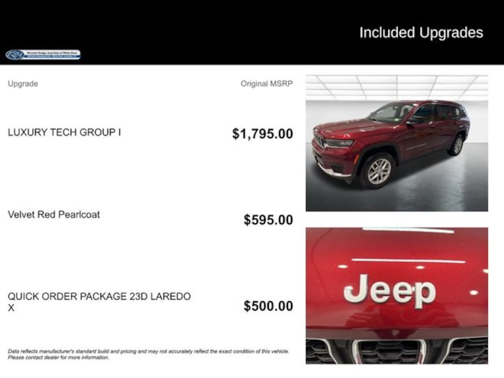 Key Chrysler Dodge Jeep Ram of White River is proud to present you with another True Market Priced Vehicle. This 2025 Jeep Grand Cherokee L Laredo is loaded with the following Factory Options: Luxury Tech Group I (115V Auxiliary Power Outlet, 3rd Row Charge-Only USB Ports, Heated Front Seats, Heated Steering Wheel, Power Liftgate, Rain Sensitive Windshield Wipers, Remote Start System, Selectable Tire Fill Alert, and Wireless Charging Pad), Quick Order Package 23D Laredo X (Laredo X and Power Sunroof), 3.45 Rear Axle Ratio, 3rd row seats: split-bench, 4-Wheel Disc Brakes, 6 Speakers, ABS brakes, Air Conditioning, Alloy wheels, AM/FM radio: SiriusXM, Anti-whiplash front head restraints, Automatic temperature control, Brake assist, Bumpers: body-color, Cloth Seats, Compass, Delay-off headlights, Driver door bin, Driver vanity mirror, Dual front impact airbags, Dual front side impact airbags, Electronic Stability Control, Emergency communication system, Four wheel independent suspension, Front anti-roll bar, Front Bucket Seats, Front Center Armrest w/Storage, Front dual zone A/C, Front License Plate Bracket, Front reading lights, Fully automatic headlights, Heated door mirrors, Illuminated entry, Knee airbag, Low tire pressure warning, Manual Fold Seatbacks, Model Year Tracking, Normal Duty Suspension, Occupant sensing airbag, Outside temperature display, Overhead airbag, Overhead console, Panic alarm, ParkView Rear Back-Up Camera, Passenger door bin, Passenger vanity mirror, Power door mirrors, Power driver seat, Power steering, Power windows, Radio data system, Radio: Uconnect 5 with 8.4" Display, Rear air conditioning, Rear anti-roll bar, Rear reading lights, Rear window defroster, Rear window wiper, Reclining 3rd row seat, Remote keyless entry, Security system, Speed control, Speed-Sensitive Wipers, Split folding rear seat, Spoiler, Steering wheel mounted audio controls, Tachometer, Telescoping steering wheel, Tilt steering wheel, Traction control, Trip computer, Variably intermittent wipers, Voltmeter, and Wheels: 18" x 8.0" Fully Painted Aluminum!!