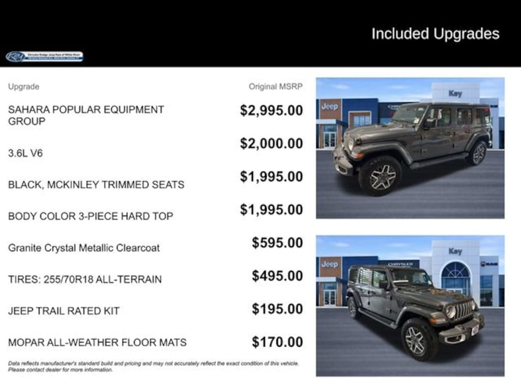 Key Chrysler Dodge Jeep Ram of White River is proud to present you with another True Market Priced Vehicle. This 2025 Jeep Wrangler Sahara is loaded with the following Factory Options: Quick Order Package 24G Sahara, Sahara Popular Equipment Group (#1 Seat Foam Cushion, 12.3" Touchscreen Display, 4G LTE Wi-Fi Hot Spot, Alpine Premium Audio System, Apple CarPlay, Auto High Beam Headlamp Control, Auto-Dimming Rear-View Mirror, Blind Spot & Cross Path Detection, Connected Travel & Traffic Services, Connectivity - US/Canada, Disassociated Touchscreen Display, For More Info, Call 800-643-2112, Google Android Auto, GPS Navigation, Hard Seat Back, HD Radio, Integrated Center Stack Radio, Integrated Off-Road Camera, Integrated Voice Command w/Bluetooth, Leather Wrapped Park Brake Handle, Leather Wrapped Shift Knob, McKinley Trimmed Seats, ParkSense Rear Park Assist System, Power 4-Way Driver Lumbar Adjust, Power 4-Way Passenger Lumbar Adjust, Power Adjust 8-Way Driver Seat, Power Adjust 8-Way Front Passenger Seat, Radio: Uconnect 5 Nav w/12.3" Display, Side Steps, SiriusXM Radio Service, SiriusXM w/360L, and Universal Garage Door Opener), 110 MPH Vehicle Max Speed Calibration, 3.45 Overall Top Gear Ratio, 4-Wheel Disc Brakes, 8 Speakers, ABS brakes, Air Conditioning, Alloy wheels, AM/FM radio: SiriusXM, Apple CarPlay/Android Auto, Automatic temperature control, Aux Battery, Body Color 3-Piece Hard Top, Brake assist, Cloth Low-Back Bucket Seats, Compass, Delay-off headlights, Driver door bin, Driver vanity mirror, Dual front impact airbags, Dual front side impact airbags, Electronic Stability Control, Emergency communication system: Jeep Connect, Freedom Panel Storage Bag, Front anti-roll bar, Front Bucket Seats, Front Center Armrest w/Storage, Front dual zone A/C, Front fog lights, Front License Plate Bracket (DISC), Front reading lights, Fully automatic headlights, Heated door mirrors, Heated front seats, Heated steering wheel, Heavy Duty Suspension w/Gas Shocks, Illuminated entry, Integrated roll-over protection, Jeep Trail Rated Kit, Low tire pressure warning, MOPAR All-Weather Floor Mats, Non-Lock Fuel Cap w/o Discriminator, Occupant sensing airbag, Outside temperature display, Overhead airbag, Panic alarm, ParkView Rear Back-Up Camera, Passenger door bin, Passenger vanity mirror, Power door mirrors, Power steering, Power windows, Radio data system, Radio: Uconnect 5 w/12.3" Display, Rear anti-roll bar, Rear reading lights, Rear Window Defroster, Rear Window Wiper/Washer, Remote keyless entry, Security system, Speed control, Split folding rear seat, Steering wheel mounted audio controls, Stop-Start Dual Battery System, Tachometer, Telescoping steering wheel, Tilt steering wheel, Traction control, Trip computer, Variably intermittent wipers, Voltmeter, and Wheels: 18" x 7.5" Machine/Painted Gray!!