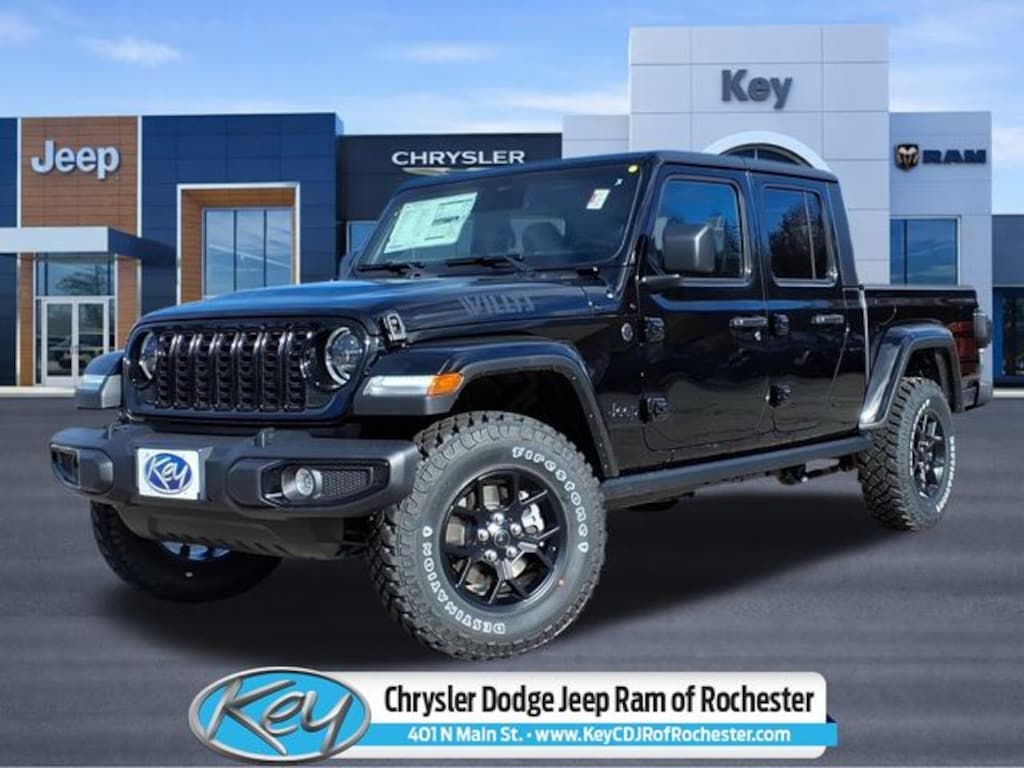 Key Chrysler Dodge Jeep Ram of Rochester is proud to present you with another True Market Priced Vehicle. This 2026 Jeep Gladiator Willys is loaded with the following Factory Options: Convenience Group (Air Conditioning with Auto Temp Control, Cluster 7.0" TFT Color Display, Corning Gorilla Glass, Daytime Running Lamp System, Emergency/Assistance Call, Front Door Locks 2-Door Passive Entry, Heated Front Seats, Heated Steering Wheel, Remote Start System, and Universal Garage Door Opener), Quick Order Package 24W Willys (2-Piece Body Color Fender Flares, 4-Wheel Drive Decal, Advanced Brake Assist, Automatic Headlamps, Auxiliary Switches, Black Grille with Gloss Black Rings, Class IV Receiver Hitch, Daytime Running Lamps LED Accents, Deep Tint Sunscreen Windows, E-Locker Rear Axle, Front Heavy Duty Red Accent Shock Absorbers, Front LED Fog Lamps, Full Speed Forward Collision Warning Plus, Heavy-Duty Engine Cooling, Increased Travel Export Tuned Suspension, LED Premium Reflector Headlamps, LED Taillamps, Mold in Color Bumper with Gloss Black, MOPAR All-Weather Slush Mats, Off-Road Plus Mode, Power Heated Mirrors, Premium Wrapped Steering Wheel, Protection Sill Rails, Rear Heavy Duty Red Accent Shock Absorbers, Security Alarm, Sun Visors with Illuminated Vanity Mirrors, Trailer Hitch Zoom, Wheels: 17" x 7.5" Painted Black, and Willys Hood Decal), 110 Mph Vehicle Max Speed Calibration, 12.3" Touchscreen Display, 3.73 Rear Axle Ratio, 4-Wheel Disc Brakes, 4G LTE Wi-Fi Hot Spot, 8 Speakers, ABS brakes, Air Conditioning, Alexa Built-in, AM/FM radio: SiriusXM with 360L, Apple CarPlay, Apple CarPlay/Android Auto, Black 3-Piece Hard Top, Brake assist, Compass, Connectivity - US/Canada, Delay-off headlights, Driver door bin, Driver vanity mirror, Dual front impact airbags, Dual front side impact airbags, Electronic Stability Control, For Details, Visit DriveUconnect.com, Freedom Panel Storage Bag, Front anti-roll bar, Front Bucket Seats, Front Center Armrest w/Storage, Front fog lights, Front License Plate Bracket, Front reading lights, Google Android Auto, Illuminated entry, Integrated Center Stack Radio, Integrated roll-over protection, Low tire pressure warning, Manufacturer's Statement of Origin, Normal Duty Suspension, Occupant sensing airbag, Outside temperature display, Overhead airbag, Panic alarm, ParkView Rear Back-Up Camera, Passenger door bin, Passenger vanity mirror, Power steering, Power windows, Radio data system, Radio: Uconnect 5 with 12.3" Display, Rear anti-roll bar, Rear reading lights, Rear Sliding Window, Rear Window Defroster, Remote keyless entry, SiriusXM Radio Service, SiriusXM with 360L, Speed control, Split folding rear seat, Steering wheel mounted audio controls, Tachometer, Telescoping steering wheel, Tilt steering wheel, Traction control, Trip computer, USB Host Flip, Variably intermittent wipers, Voltmeter, and Wheels: 17" x 7.5" Black Steel Styled!! Call us to ask about conditional rebates. Price includes: $1000 - 2026 National Retail Bonus Cash . Exp. 04/30/2026 $500 - 2026 National Select Inventory Bonus Cash. Exp. 01/04/2027