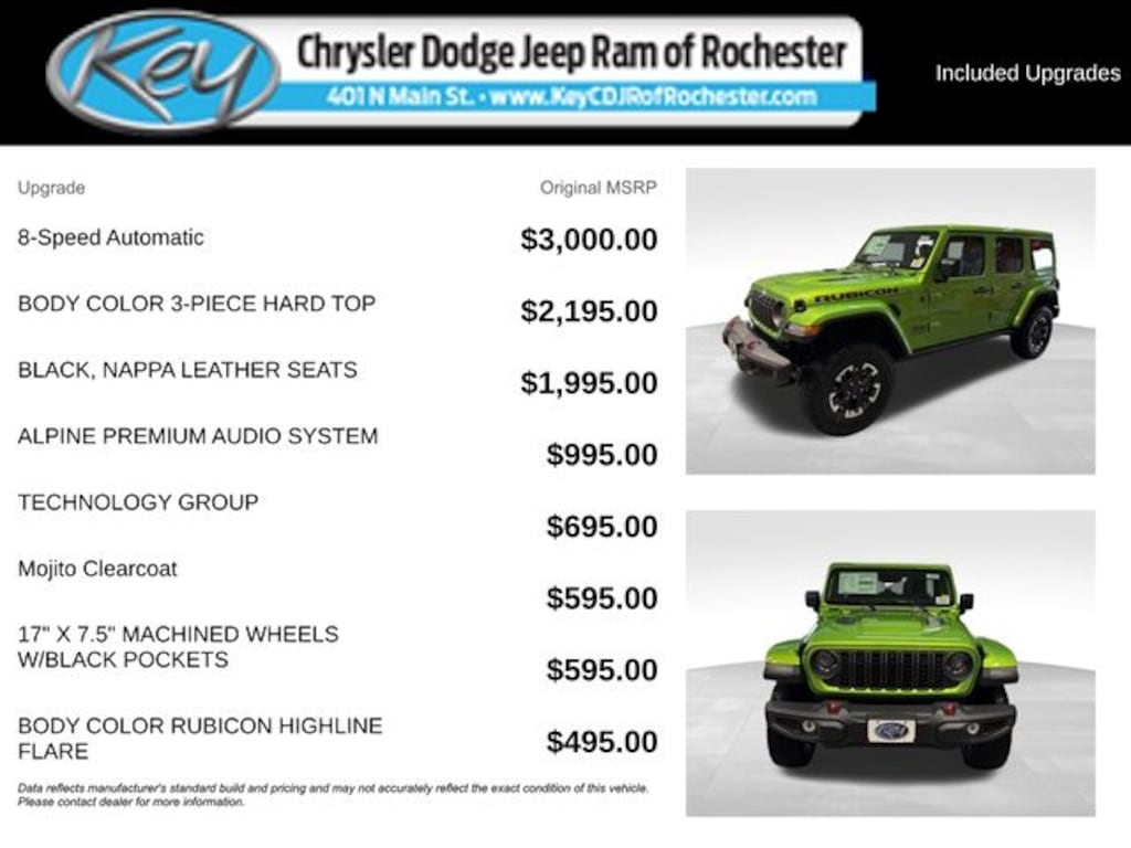 Key Chrysler Dodge Jeep Ram of Rochester is proud to present you with another True Market Priced Vehicle. This 2026 Jeep Wrangler Rubicon is loaded with the following Factory Options: Convenience Group (Heated Front Seats, Heated Steering Wheel, and Universal Garage Door Opener), Quick Order Package 22R Rubicon, Technology Group (12.3" Touchscreen Display, 4G LTE Wi-Fi Hot Spot, Apple CarPlay, Auto-Dimming Rear-View Mirror, Connected Travel and Traffic Services, Connectivity - US/Canada, For More Info, Call 800-643-2112, Google Android Auto, GPS Navigation, HD Radio, Integrated Center Stack Radio, Integrated Off-Road Camera, Integrated Voice Command with Bluetooth, Radio: Uconnect 5 Navigation with 12.3" Display, SiriusXM Radio Service, and SiriusXM with 360L), 4-Wheel Disc Brakes, 4.10 Rear Axle Ratio, 8 Speakers, ABS brakes, Air Conditioning, Alloy wheels, Alpine Premium Audio System, AM/FM radio: SiriusXM with 360L, Apple CarPlay/Android Auto, Automatic temperature control, Aux Battery, Auxiliary Switches, Body Color 3-Piece Hard Top, Body Color Rubicon Highline Flare, Brake assist, Class II Receiver Hitch, Cloth Low-Back Bucket Seats, Compass, Delay-off headlights, Driver door bin, Driver vanity mirror, Dual front impact airbags, Dual front side impact airbags, Electronic Stability Control, Emergency communication system: Jeep Connect, Freedom Panel Storage Bag, Front anti-roll bar, Front Bucket Seats, Front Center Armrest w/Storage, Front dual zone A/C, Front fog lights, Front License Plate Bracket, Front reading lights, Fully automatic headlights, Heated door mirrors, Illuminated entry, Integrated roll-over protection, Jeep Trail Rated Kit, Low tire pressure warning, MOPAR All-Weather Floor Mats, No Soft Top, Non-Lock Fuel Cap Without Discriminator, Occupant sensing airbag, Outside temperature display, Overhead airbag, Panic alarm, ParkView Rear Back-Up Camera, Passenger door bin, Passenger vanity mirror, Performance Suspension, Power door mirrors, Power steering, Power windows, Radio data system, Radio: Uconnect 5 with 12.3" Display, Rear anti-roll bar, Rear reading lights, Rear Window Defroster, Rear Window Wiper/Washer, Remote keyless entry, Security system, Speed control, Split folding rear seat, Steering wheel mounted audio controls, Stop-Start Dual Battery System, Tachometer, Telescoping steering wheel, Tilt steering wheel, Traction control, Trip computer, Variably intermittent wipers, Voltmeter, Wheels: 17" x 7.5" Machined with Black Pockets, and Wheels: 17" x 7.5" Machined/Painted Black!! Call us to ask about conditional rebates. Price includes: $1000 - 2026 National Retail Bonus Cash . Exp. 04/30/2026 $2000 - 2026 National Select Inventory Bonus Cash. Exp. 01/04/2027