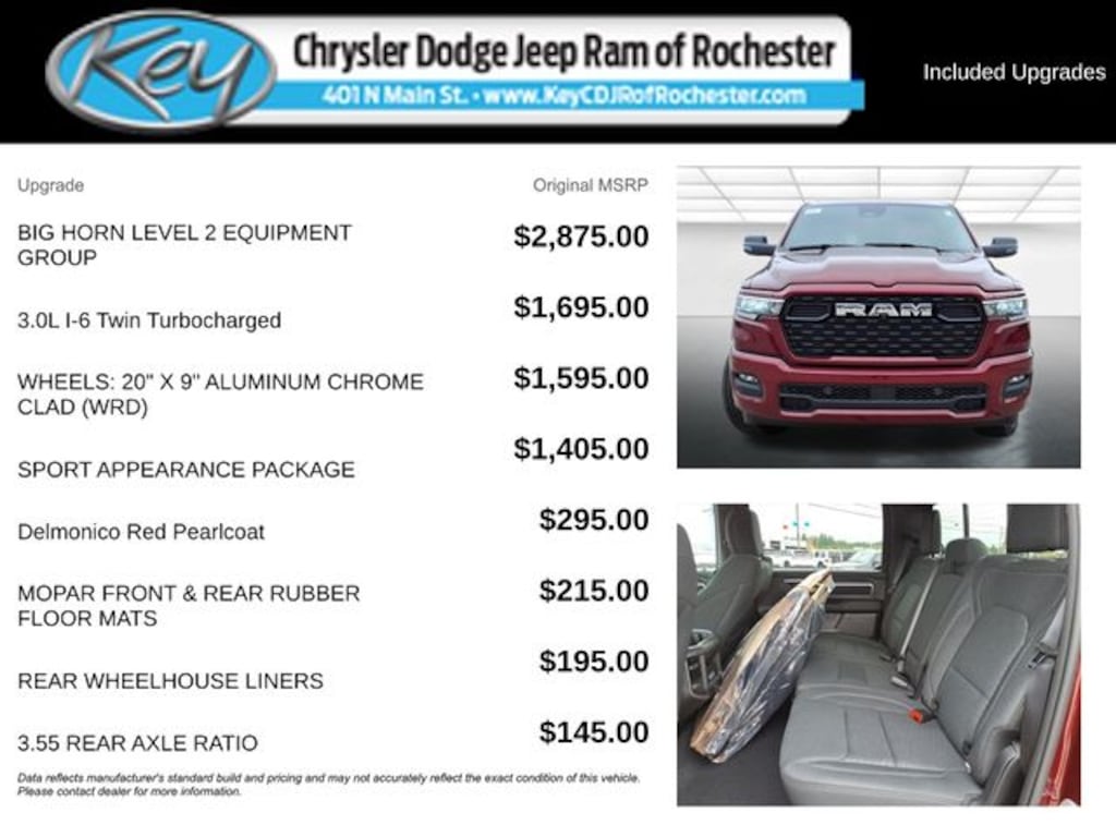 Key Chrysler Dodge Jeep Ram of Rochester is proud to present you with another True Market Priced Vehicle. This 2026 Ram 1500 Big Horn/Lone Star is loaded with the following Factory Options: Big Horn Level 2 Equipment Group (115V Auxiliary Power Outlet, 115V Auxiliary Rear Power Outlet, 12" Touchscreen Display, 2nd Row in Floor Storage Bins, 3 Rear Seat Head Restraints, 4 Way Front Headrests, 400W Inverter, 4G LTE Wi-Fi Hot Spot, 9 Amplified Speakers with Subwoofer, Air Conditioning ATC with Dual Zone Control, Apple CarPlay, Auto Power-Folding Mirrors, Auto-Dimming Exterior Driver Mirror, Auto-Dimming Rear-View Mirror, Black Exterior Mirrors, Black Premium Power Mirrors, Body Color Fender Flares, Bucket Seats, Center Console Parts Module, Cluster 7.0" TFT Color Display, Configurable Drive Mode, Connected Travel and Traffic Services, Connectivity - US/Canada, Convex Wide-Angle Exterior Mirror Insert, Deluxe Cloth Bucket Seats, Disassociated Touchscreen Display, Exterior Mirrors Courtesy Lamps, Exterior Mirrors with Heating Element, Exterior Mirrors with Supplemental Signals, Front Seat Back Map Pockets, Full Length Floor Console, Global Telematics Box Module, Glove Box Lamp, Google Android Auto, GPS Antenna Input, GPS Navigation, HD Radio, Heated Front Seats, Heated Steering Wheel, Integrated Center Stack Radio, Integrated Voice Command with Bluetooth, Leather Wrapped Steering Wheel, LED Dome Lamp with on/Off Switch, LED Footwell Lighting, Manual Adjust 4-Way Front Passenger Seat, Media Hub with 2 Charge Only USBs, Overhead LED Lamps, Power 2-Way Driver Lumbar Adjust, Power Adjust 8-Way Driver Seat, Power Adjustable Pedals, Premium Overhead Console, Radio: Uconnect 5 Navigation with 12.0" Display, Rear 60/40 Folding Seat, Rear Center Armrest, Rear Power Sliding Window, Rear Window Defroster, Remote Tailgate Release, Security Alarm, SiriusXM Radio Service, SiriusXM with 360L, Steering Wheel Mounted Audio Controls, Sun Visors with Illuminated Vanity Mirrors, Universal Garage Door Opener, USB Host Flip, and Wheels: 20" x 9" Aluminum Chrome Clad), Quick Order Package 21Z Big Horn, Sport Appearance Package (Black Interior Accents, Body Color Door Handles, Body Color Front Bumper, Body Color Rear Bumper with Step Pads, Body Color Tailgate Handle, Grille Surround 1 Body Color Texture 1 Black, and RAM Grille Badge - Chrome), 4-Wheel Disc Brakes, 48V Belt Starter Generator, 6 Speakers, ABS brakes, Air Conditioning, Alloy wheels, AM/FM radio, Apple CarPlay/Android Auto, Auto High-beam Headlights, Brake assist, Bumpers: chrome, Cloth Bucket Seats, Compass, Delay-off headlights, Driver door bin, Dual front impact airbags, Dual front side impact airbags, Electronic Stability Control, Front anti-roll bar, Front Bucket Seats, Front Center Armrest w/Storage, Front fog lights, Front License Plate Bracket, Front reading lights, Front wheel independent suspension, Fully automatic headlights, Heated door mirrors, Illuminated entry, Low tire pressure warning, Manual Adjust 4-Way Driver Seat, Manual Folding Exterior Mirror Call us to ask about conditional rebates. Price includes: $3500 - 2026 National Retail Consume