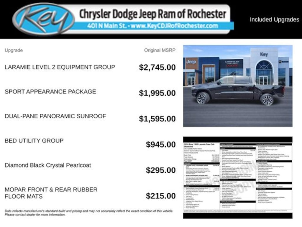 Key Chrysler Dodge Jeep Ram of Rochester is proud to present you with another True Market Priced Vehicle. This 2026 Ram 1500 Laramie is loaded with the following Factory Options: Bed Utility Group (Exterior 115V AC Outlet, MOPAR 4 Adjustable Cargo Tie-Down Hooks, and MOPAR Spray in Bedliner), Laramie Level 2 Equipment Group (14.4" Touchscreen Display, 4G LTE Wi-Fi Hot Spot, Cluster 12" TFT Color Display, Connected Travel and Traffic Services, Connectivity - US/Canada, Front Passenger Interactive Display, GPS Navigation, Harman/Kardon 19 Speaker Premium Sound, Integrated Center Stack Radio, Integrated Voice Command with Bluetooth, Power Tailgate, Radio: Uconnect 5 Nav with 14.4" Display, Rain Sensitive Windshield Wipers, SiriusXM Radio Service, SiriusXM with 360L, and USB Host Flip), Quick Order Package 21H Laramie, Sport Appearance Package (Accent Color Premium Power Mirrors, Auto Power-Folding Mirrors, Auto-Dimming Exterior Driver Mirror, Black Interior Accents, Black Painted Exterior Mirrors Caps, Body Color Front Bumper, Body Color Rear Bumper with Step Pads, Bridgestone Brand Tires, Convex Wide-Angle Exterior Mirror Insert, Exterior Mirrors Courtesy Lamps, Exterior Mirrors with Heating Element, Exterior Mirrors with Memory, Exterior Mirrors with Supplemental Signals, Grille Surround 3 Body Color Tex 2 Black, RAM Grille Badge - Chrome, and Sport Performance Hood), 10 Speakers, 3.55 Rear Axle Ratio, 4-Wheel Disc Brakes, ABS brakes, Active Noise Control System, Air Conditioning, Alloy wheels, AM/FM radio: SiriusXM with 360L, Apple CarPlay/Android Auto, Audio memory, Auto High-beam Headlights, Auto-dimming door mirrors, Auto-dimming Rear-View mirror, Automatic temperature control, Brake assist, Bumpers: chrome, Chrome Exterior Mirrors, Compass, Delay-off headlights, Dome Dual LED Reading Lamp, Driver door bin, Driver vanity mirror, Dual front impact airbags, Dual front side impact airbags, Dual-Pane Panoramic Sunroof, Electronic Stability Control, Front anti-roll bar, Front Bucket Seats, Front Center Armrest w/Storage, Front dual zone A/C, Front fog lights, Front License Plate Bracket, Front reading lights, Front wheel independent suspension, Fully automatic headlights, Garage door transmitter, Heated door mirrors, Heated front seats, Heated rear seats, Heated steering wheel, Illuminated entry, Leather steering wheel, Leather Trimmed Bucket Seats, LED Dome/Reading Lamp, Low tire pressure warning, Manufacturer's Statement of Origin, Memory seat, MOPAR Front and Rear Rubber Floor Mats, Navigation System, Occupant sensing airbag, Off-Road Information Pages, Outside temperature display, Overhead airbag, Overhead console, Panic alarm, ParkView Rear Back-Up Camera, Passenger door bin, Passenger vanity mirror, Power door mirrors, Power driver seat, Power passenger seat, Power steering, Power windows, Radio data system, Radio: Uconnect 5 Navigation with 12.0" Display, Rear anti-roll bar, Rear reading lights, Rear seat center armrest, Rear step bumper, Remote keyless entry, Security system, Speed control, Split Call us to ask about conditional rebates. Price includes: $3500 - 2026 National Retail Consume
