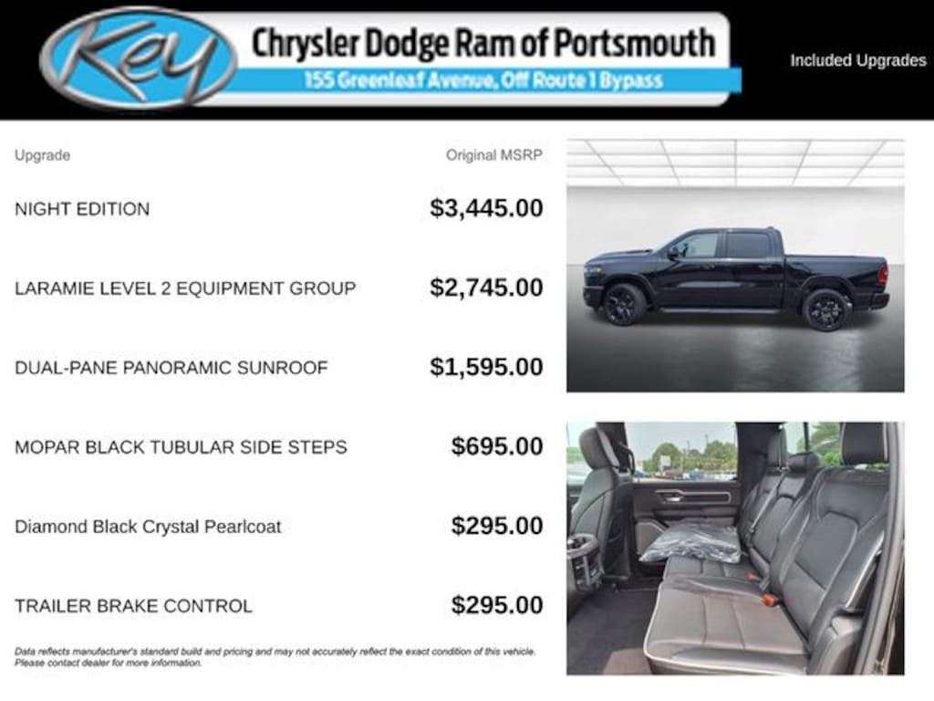 Key Chrysler Dodge Ram of Portsmouth is proud to present you with another True Market Priced Vehicle. This 2026 Ram 1500 Laramie is loaded with the following Factory Options: Laramie Level 2 Equipment Group (14.4" Touchscreen Display, 4G LTE Wi-Fi Hot Spot, Cluster 12" TFT Color Display, Connectivity - US/Canada, Front Passenger Interactive Display, GPS Navigation, Integrated Center Stack Radio, Power Tailgate, Rain Sensitive Windshield Wipers, SiriusXM Radio Service, and USB Host Flip), Night Edition (Accent Color Door Handles, Accent Color Premium Power Mirrors, Accent Color Tailgate Handle, Anti-Spin Differential Rear Axle, Auto Power-Folding Mirrors, Auto-Dimming Exterior Driver Mirror, Black Exterior Truck Badging, Black Headlamp Bezels, Black Interior Accents, Black Painted Exterior Mirrors Caps, Black Tail Lamp Bezels, Body Color Front Bumper, Convex Wide-Angle Exterior Mirror Insert, Exterior Mirrors Approach Lamps, Exterior Mirrors Courtesy Lamps, Grille Surround 3 Black Texture 2 Black, Pirelli Brand Tires, Proximity Approach/Departure Lamps, RAM Grille Badge - Black, Sport Performance Hood, and Wheels: 22" x 9" Forged Aluminum), Quick Order Package 21H Laramie, 10 Speakers, 3.55 Rear Axle Ratio, 4-Wheel Disc Brakes, ABS brakes, Active Noise Control System, Air Conditioning, Alloy wheels, AM/FM radio: SiriusXM with 360L, Apple CarPlay/Android Auto, Audio memory, Auto High-beam Headlights, Auto-dimming door mirrors, Auto-dimming Rear-View mirror, Automatic temperature control, Brake assist, Bumpers: chrome, Chrome Exterior Mirrors, Compass, Delay-off headlights, Dome Dual LED Reading Lamp, Driver door bin, Driver vanity mirror, Dual front impact airbags, Dual front side impact airbags, Dual-Pane Panoramic Sunroof, Electronic Stability Control, Front anti-roll bar, Front Bucket Seats, Front Center Armrest w/Storage, Front dual zone A/C, Front fog lights, Front License Plate Bracket, Front reading lights, Front wheel independent suspension, Fully automatic headlights, Garage door transmitter, Heated door mirrors, Heated front seats, Heated rear seats, Heated steering wheel, Illuminated entry, Leather steering wheel, Leather Trimmed Bucket Seats, LED Dome/Reading Lamp, Low tire pressure warning, Manufacturer's Statement of Origin, Memory seat, Mopar Black Tubular Side Steps, Navigation System, Occupant sensing airbag, Off-Road Information Pages, Outside temperature display, Overhead airbag, Overhead console, Panic alarm, ParkView Rear Back-Up Camera, Passenger door bin, Passenger vanity mirror, Power door mirrors, Power driver seat, Power passenger seat, Power steering, Power windows, Radio data system, RAM Grille Badge - Chrome, Rear anti-roll bar, Rear reading lights, Rear seat center armrest, Rear step bumper, Remote keyless entry, Security system, Speed control, Split folding rear seat, Steering wheel mounted audio controls, Tachometer, Telescoping steering wheel, Tilt steering whe
