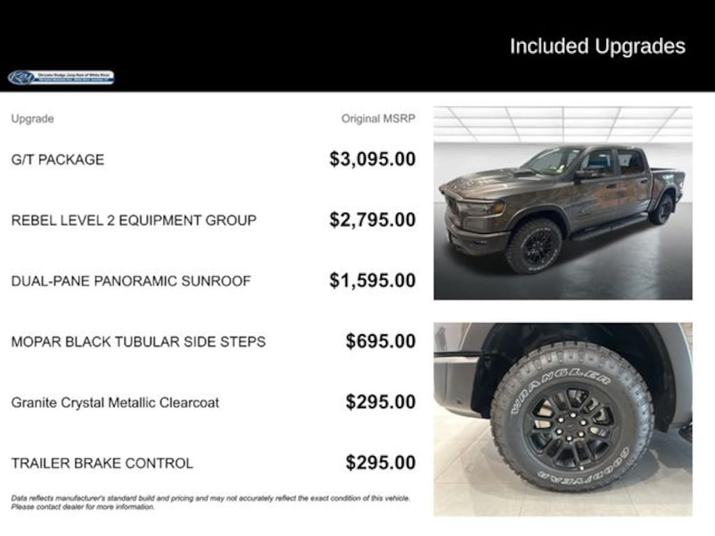 Key Chrysler Dodge Jeep Ram of White River is proud to present you with another True Market Priced Vehicle. This 2026 Ram 1500 Rebel is loaded with the following Factory Options: G/T Package (4 Way Front Headrests, Bucket Seats, Driver Seat Memory, Floor Console, Front Seat Back Map Pockets, G/T Decal, G/T Exhaust, GT Interior Theme, Heated Front Seats, Heated Second Row Seats, Heated Steering Wheel, Leather Wrapped Shift Knob, Leather-Wrapped Steering Wheel, Leather/Vinyl Bucket Seats, MOPAR Bright Pedal Kit, Performance Pages, Power 4-Way Driver Lumbar Adjust, Power 4-Way Passenger Lumbar Adjust, Power Adjust 8-Way Driver Seat, Power Adjust 8-Way Front Passenger Seat, Rear 60/40 Folding Split Recline Seat, Steering Wheel Mounted Shift Control, Under Seat Lighting, and Ventilated Front Seats), Quick Order Package 21W Rebel, Rebel Level 2 Equipment Group (115V Auxiliary Rear Power Outlet, 14.4" Touchscreen Display, 2-Door Passive Entry, Front Door Locks, 4G LTE Wi-Fi Hot Spot, Accent Color Door Handles, Accent Color Premium Power Mirrors, Accent Color Tailgate Handle, Apple CarPlay, Auto Power-Folding Mirrors, Auto-Dimming Exterior Driver Mirror, Black Painted Exterior Mirrors Caps, Connectivity - US/Canada, Convex Wide-Angle Exterior Mirror Insert, Disassociated Touchscreen Display, Dual Wireless Charging Pad, Exterior Mirrors Approach Lamps, Exterior Mirrors Courtesy Lamps, Front Passenger Interactive Display, Google Android Auto, GPS Antenna Input, GPS Navigation, HD Radio, Integrated Center Stack Radio, Off-Road Information Pages, Power 2-Way Passenger Lumbar Adjust, Power Tailgate, Proximity Approach/Departure Lamps, Radio/Driver Seat/Mirrors/Pedals Memory, Rain Sensitive Windshield Wipers, Rear Window Defroster, Security Alarm, SiriusXM Radio Service, and USB Host Flip), 10 Speakers, 3.92 Rear Axle Ratio, 4-Wheel Disc Brakes, ABS brakes, Air Conditioning, Alloy wheels, AM/FM radio: SiriusXM with 360L, Apple CarPlay/Android Auto, Auto High-beam Headlights, Auto-dimming Rear-View mirror, Automatic temperature control, Black Exterior Mirrors, Brake assist, Cloth/Vinyl Bucket Seats, Compass, Delay-off headlights, Dome Dual LED Reading Lamp, Driver door bin, Driver vanity mirror, Dual front impact airbags, Dual front side impact airbags, Dual-Pane Panoramic Sunroof, Electronic Stability Control, Front anti-roll bar, Front Bucket Seats, Front Center Armrest w/Storage, Front dual zone A/C, Front fog lights, Front License Plate Bracket, Front reading lights, Front wheel independent suspension, Full Length Upgraded Floor Console, Fully automatic headlights, Garage door transmitter, Heated door mirrors, Heated front seats, Heated steering wheel, Illuminated entry, Leather steering wheel, Low tire pressure warning, Manual Folding Exterior Mirrors, Manufacturer's Statement of Origin, Mopar Black Tubular Side Steps, Navigation System, Occupant sensing airbag, Outside temperature display, Overhead airbag, Overhead console, Panic alarm, ParkView Rear Back-Up Camera, Passenger door bin, Passenger vanity mirror, Power 2-Way Driver Lumbar Adjust, Power door mirrors, Power driver seat, Po