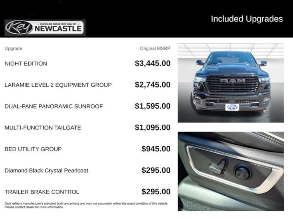 Key Chrysler Dodge Ram of Portsmouth is proud to present you with another True Market Priced Vehicle. This 2026 Ram 1500 Laramie is loaded with the following Factory Options: Bed Utility Group (Exterior 115V AC Outlet, MOPAR 4 Adjustable Cargo Tie-Down Hooks, and MOPAR Spray In Bedliner), Laramie Level 2 Equipment Group (14.4" Touchscreen Display, 4G LTE Wi-Fi Hot Spot, Cluster 12" TFT Color Display, Connected Travel & Traffic Services, Connectivity - US/Canada, Front Passenger Interactive Display, GPS Navigation, harman/kardon 19 Speaker Premium Sound, Integrated Center Stack Radio, Integrated Voice Command w/Bluetooth, Power Tailgate, Radio: Uconnect 5 Nav w/14.4" Display, Rain Sensitive Windshield Wipers, SiriusXM Radio Service, SiriusXM w/360L, and USB Host Flip), Night Edition (Accent Color Door Handles, Accent Color Premium Power Mirrors, Accent Color Tailgate Handle, Anti-Spin Differential Rear Axle, Auto Power-Folding Mirrors, Auto-Dimming Exterior Driver Mirror, Black Exterior Truck Badging, Black Headlamp Bezels, Black Interior Accents, Black Painted Exterior Mirrors Caps, Black Tail Lamp Bezels, Body Color Front Bumper, Body Color Rear Bumper w/Step Pads, Convex Wide-Angle Exterior Mirror Insert, Dual Exhaust w/Black Tips, Exterior Mirrors Approach Lamps, Exterior Mirrors Courtesy Lamps, Exterior Mirrors w/Heating Element, Exterior Mirrors w/Memory, Exterior Mirrors w/Supplemental Signals, Grille Surround 3 Black Texture 2 Black, Pirelli Brand Tires, Proximity Approach/Departure Lamps, RAM Grille Badge - Black, Sport Performance Hood, and Wheels: 22" x 9" Forged Aluminum), Quick Order Package 21H Laramie, 10 Speakers, 3.55 Rear Axle Ratio, 4-Wheel Disc Brakes, ABS brakes, Active Noise Control System, Air Conditioning, Alloy wheels, AM/FM radio: SiriusXM with 360L, Apple CarPlay/Android Auto, Audio memory, Auto High-beam Headlights, Auto-dimming door mirrors, Auto-dimming Rear-View mirror, Automatic temperature control, Brake assist, Bumpers: chrome, Chrome Exterior Mirrors, Compass, Delay-off headlights, Dome Dual LED Reading Lamp, Driver door bin, Driver vanity mirror, Dual front impact airbags, Dual front side impact airbags, Dual-Pane Panoramic Sunroof, Electronic Stability Control, Front anti-roll bar, Front Bucket Seats, Front Center Armrest w/Storage, Front dual zone A/C, Front fog lights, Front License Plate Bracket, Front reading lights, Front wheel independent suspension, Fully automatic headlights, Garage door transmitter, Heated door mirrors, Heated front seats, Heated rear seats, Heated steering wheel, Illuminated entry, Leather steering wheel, Leather Trimmed Bucket Seats, LED Dome/Reading Lamp, Low tire pressure warning, Manufacturer's Statement of Origin, Memory seat, Multi-Function Tailgate, Navigation System, Occupant sensing airbag, Off-Road Information Pages, Outside temperature display, Overhead airbag, Overhead console, Panic alarm, ParkView Rear Back-Up Camer