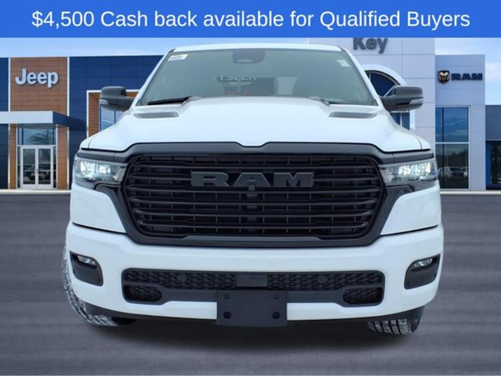 Key Chrysler Dodge Jeep Ram of Rochester is proud to present you with another True Market Priced Vehicle. This 2026 Ram 1500 Laramie is loaded with the following Factory Options: Bed Utility Group (Exterior 115V AC Outlet, MOPAR 4 Adjustable Cargo Tie-Down Hooks, and MOPAR Spray in Bedliner), Laramie Level 2 Equipment Group (14.4" Touchscreen Display, 4G LTE Wi-Fi Hot Spot, Cluster 12" TFT Color Display, Connected Travel and Traffic Services, Connectivity - US/Canada, Front Passenger Interactive Display, GPS Navigation, Harman/Kardon 19 Speaker Premium Sound, Integrated Center Stack Radio, Integrated Voice Command with Bluetooth, Power Tailgate, Radio: Uconnect 5 Nav with 14.4" Display, Rain Sensitive Windshield Wipers, SiriusXM Radio Service, SiriusXM with 360L, and USB Host Flip), Night Edition (Accent Color Door Handles, Accent Color Premium Power Mirrors, Accent Color Tailgate Handle, Anti-Spin Differential Rear Axle, Auto Power-Folding Mirrors, Auto-Dimming Exterior Driver Mirror, Black Exterior Truck Badging, Black Headlamp Bezels, Black Interior Accents, Black Painted Exterior Mirrors Caps, Black Tail Lamp Bezels, Body Color Front Bumper, Body Color Rear Bumper with Step Pads, Convex Wide-Angle Exterior Mirror Insert, Dual Exhaust with Black Tips, Exterior Mirrors Approach Lamps, Exterior Mirrors Courtesy Lamps, Exterior Mirrors with Heating Element, Exterior Mirrors with Memory, Exterior Mirrors with Supplemental Signals, Grille Surround 3 Black Texture 2 Black, Pirelli Brand Tires, Proximity Approach/Departure Lamps, RAM Grille Badge - Black, Sport Performance Hood, and Wheels: 22" x 9" Forged Aluminum), Quick Order Package 27H Laramie, Trailer Tow Group II (Trailer Brake Control, Trailer Light Check, Trailer Reverse Steering Control, and Trailer Tire Pressure Monitoring System), 10 Speakers, 33 Gallon Fuel Tank, 4-Wheel Disc Brakes, ABS brakes, Active Noise Control System, Adjustable pedals, Air Conditioning, Alloy wheels, AM/FM radio: SiriusXM with 360L, Apple CarPlay/Android Auto, Audio memory, Auto High-beam Headlights, Auto-dimming door mirrors, Auto-dimming Rear-View mirror, Automatic temperature control, Brake assist, Bumpers: chrome, Chrome Exterior Mirrors, Compass, Delay-off headlights, Dome Dual LED Reading Lamp, Driver door bin, Driver vanity mirror, Dual front impact airbags, Dual front side impact airbags, Dual-Pane Panoramic Sunroof, Electronic Stability Control, Front anti-roll bar, Front Bucket Seats, Front Center Armrest w/Storage, Front dual zone A/C, Front fog lights, Front License Plate Bracket, Front reading lights, Front wheel independent suspension, Fully automatic headlights, Garage door transmitter, Heated door mirrors, Heated front seats, Heated rear seats, Heated steering wheel, Illuminated entry, Leather steering wheel, Leather Trimmed Bucket Seats, LED Dome/Reading Lamp, Low tire pressure warning, Manufacturer's Statement of Origin, Memory seat, Mopar Black Tubular Side Steps, MOPAR Fron Call us to ask about conditional rebates. Price includes: $1000 - 2026 National Bonus Cash . Exp. 03/31/2026 $3500 - 2026 National Retail Consume