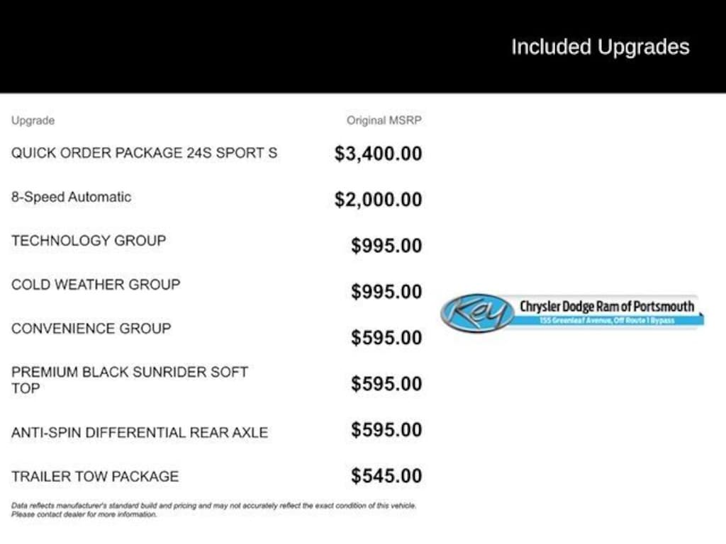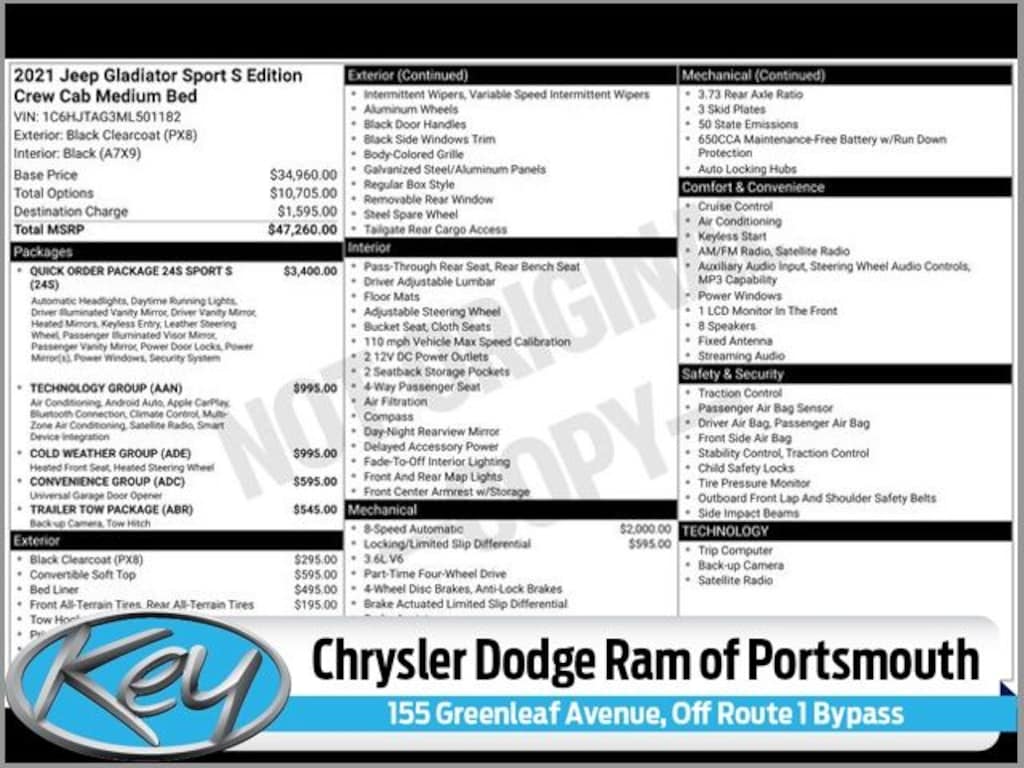 Key Chrysler Dodge Ram of Portsmouth is proud to present you with another True Market Priced Pre-Owned Vehicle. Transparent Pricing Of $ 26499 !! This 2021 Jeep Gladiator Sport is loaded with the following Factory Options: Cold Weather Group, Convenience Group, Quick Order Package 24S Sport S (Automatic Headlamps, Body Color Fender Flares (2-Piece), Daytime Running Lamp System, Deep Tint Sunscreen Windows, Front 1-Touch Down Power Windows, Leather Wrapped Steering Wheel, Molded in Color Bumper w/Accent Color, Normal Duty Plus Suspension, Power Heated Mirrors, Power Tailgate Lock, Remote Keyless Entry, Security Alarm, Speed Sensitive Power Locks, Sport S, and Sun Visors w/Illuminated Vanity Mirrors), Technology Group (7.0" Touch Screen Display, Air Conditioning w/Auto Temperature Control, Apple CarPlay, Cluster 7.0" TFT Color Display, For More Info, Call 800-643-2112, Google Android Auto, GPS Antenna Input, Integrated Center Stack Radio, Integrated Voice Command w/Bluetooth, Radio: Uconnect 4 w/7" Display, SiriusXM Radio Service, SiriusXM Satellite Radio, and USB Host Flip), Trailer Tow Package (240 Amp Alternator, Class IV Hitch Receiver, Heavy-Duty Engine Cooling, and Trailer Hitch Zoom), 110 mph Vehicle Max Speed Calibration, 3.73 Rear Axle Ratio, 4-Wheel Disc Brakes, 8 Speakers, ABS brakes, Air Conditioning, AM/FM radio, Anti-Lock 4-Wheel Disc Heavy Duty Brakes, Anti-Spin Differential Rear Axle, Brake assist, Cloth Low-Back Bucket Seats, Compass, Delay-off headlights, Driver door bin, Driver vanity mirror, Dual front impact airbags, Dual front side impact airbags, Electronic Stability Control, Front anti-roll bar, Front Bucket Seats, Front Center Armrest w/Storage, Front fog lights, Front reading lights, Integrated roll-over protection, Low tire pressure warning, MOPAR Spray In Bedliner, Normal Duty Suspension, Occupant sensing airbag, Outside temperature display, ParkView Rear Back-Up Camera, Passenger door bin, Passenger vanity mirror, Power steering, Premium Black Sunrider Soft Top, Radio data system, Radio: Uconnect 3 w/5" Display, Rear anti-roll bar, Rear reading lights, Speed control, Split folding rear seat, Steering wheel mounted audio controls, Tachometer, Telescoping steering wheel, Tilt steering wheel, Traction control, Trip computer, Variably intermittent wipers, Wheels: 17" x 7.5" Black Steel Styled, and Wheels: 17" x 7.5" Tech Silver Aluminum (DISC)!!